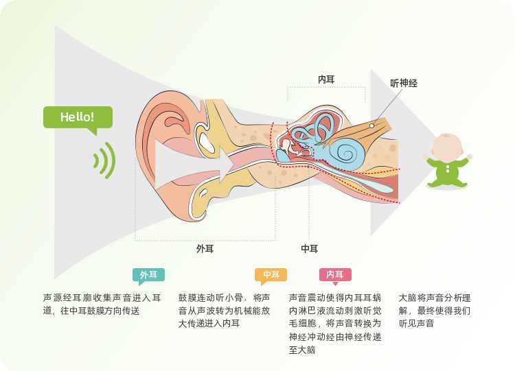 当声音从外耳-中耳-内耳-听神经,最终传递至大脑,在这路径中任何一个环节出现问题,使得声音无法完整传递时,都会造成听力损失,我们可以根据上一篇的听力测听项目,得知病灶发生位置去区分听损类型。