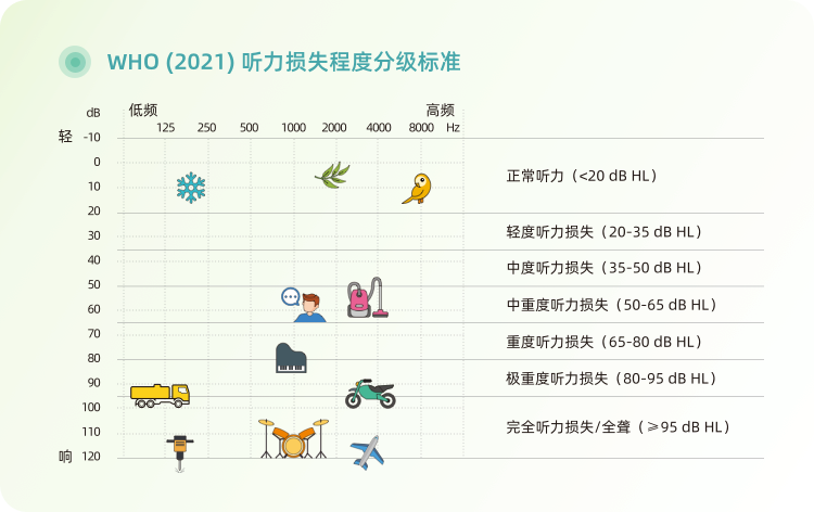 由于声音无法在传递路径顺利的传递,孩子只能听到部分的声音,我们可以从听力测听得到孩子的听力阈值,根据受损程度进行了分类,透过听损程度的描述,我们可以得知孩子未经过辅具矫正前的聆听状况。