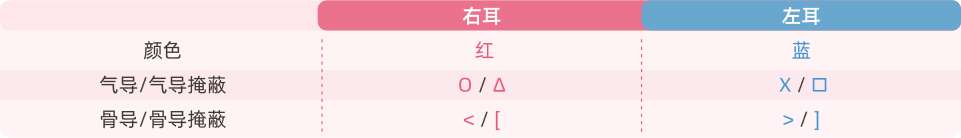在听力学上,红色代表右耳,蓝色代表左耳,未来孩子听力图、助听器标记、测听设备上的标记都会出现这样的区分,便于一眼就区分两耳。气导标记代表是听觉系统的整体反映(外耳、中耳、内耳),骨导代表的是内耳以上的反应,透过气骨导数值,我们可以知道听力受损位置、听损类型、损失程度。