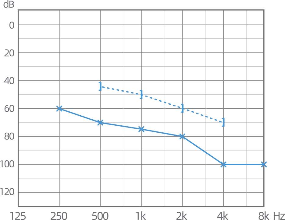 这张听力图的标记为蓝色X,代表是左耳的听力,气导听力从60分贝至100分贝,骨导掩蔽听力45分贝至70分贝,气骨导差值超过15分贝。